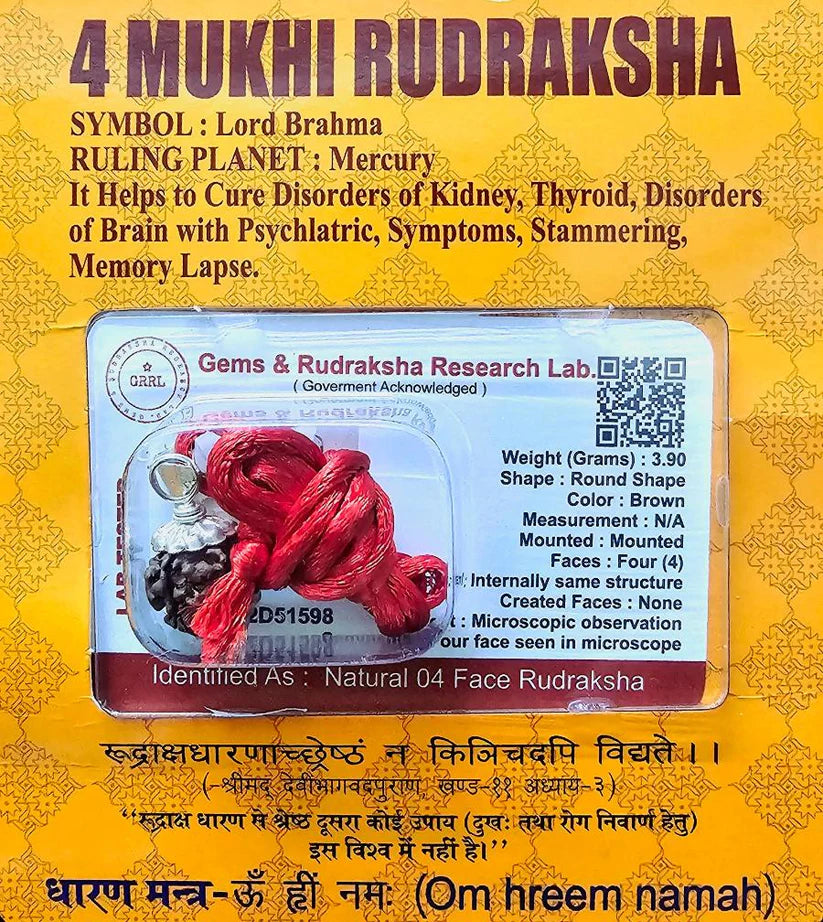The 4 Mukhi Rudraksha is believed by the Shastras to be Lord Brahma incarnate and its controlling planet is Mercury.